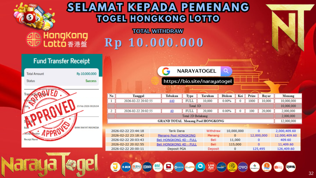 Selamat kepada User id RENFF* Telah berhasil mendapatkan kemenangan besar pada permainan TOGEL HONGKONG LOTTO Dengan kemenangan Sebesar Rp 10.000.000 Setelah mengisi formulir withdraw dengan kurang waktu hanya 1 – 10 menit pihak NARAYATOGEL sudah melakukan transfer kepada pemiliknya dan dana sudah masuk ke rekening id tersebut oleh pemenang. Bukti pembayaran yang kami berikan merupakan bukti pembayaran yang SAH / VALID yang langsung di dapatkan melalui tanda transfer transaksi berhasil dari Bank yang di tuju.