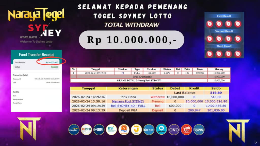 Selamat kepada User id HOP* Telah berhasil mendapatkan kemenangan besar pada permainan TOGEL SDYNEY LOTTO Dengan kemenangan Sebesar Rp 10.000.000 Setelah mengisi formulir withdraw dengan kurang waktu hanya 1 – 10 menit pihak NARAYATOGEL sudah melakukan transfer kepada pemiliknya dan dana sudah masuk ke rekening id tersebut oleh pemenang. Bukti pembayaran yang kami berikan merupakan bukti pembayaran yang SAH / VALID yang langsung di dapatkan melalui tanda transfer transaksi berhasil dari Bank yang di tuju.