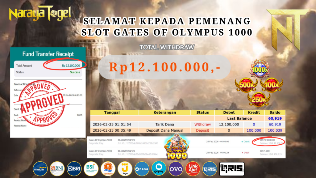 Selamat kepada User id YUER** Telah berhasil mendapatkan kemenangan besar pada permainan SLOT GATES OF OLYMPUS 1000 Dengan kemenangan Sebesar  Rp 12.100.000 Setelah mengisi formulir withdraw dengan kurang waktu hanya 1 – 10 menit pihak NARAYATOGEL sudah melakukan transfer kepada pemiliknya dan dana sudah masuk ke rekening id tersebut oleh pemenang. Bukti pembayaran yang kami berikan merupakan bukti pembayaran yang SAH / VALID yang langsung di dapatkan melalui tanda transfer transaksi berhasil dari Bank yang di tuju.