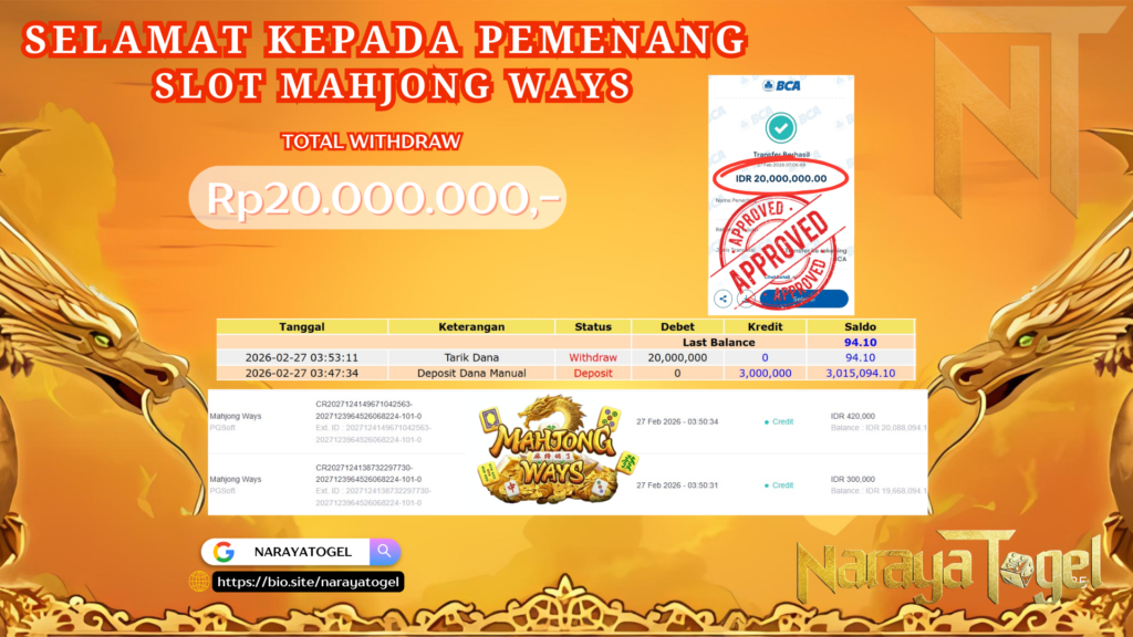 Selamat kepada User id OUOE** Telah berhasil mendapatkan kemenangan besar pada permainan SLOT MAHJONG WAYS Dengan kemenangan Sebesar Rp 20.000.000 Setelah mengisi formulir withdraw dengan kurang waktu hanya 1 – 10 menit pihak NARAYATOGEL sudah melakukan transfer kepada pemiliknya dan dana sudah masuk ke rekening id tersebut oleh pemenang. Bukti pembayaran yang kami berikan merupakan bukti pembayaran yang SAH / VALID yang langsung di dapatkan melalui tanda transfer transaksi berhasil dari Bank yang di tuju.