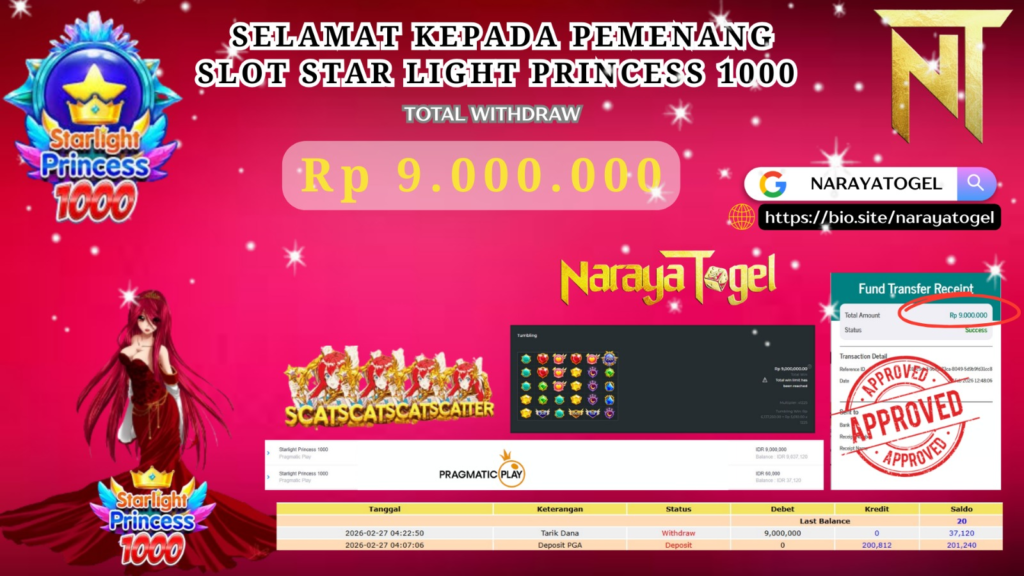 Selamat kepada User id HYU* Telah berhasil mendapatkan kemenangan besar pada permainan SLOT STAR LIGHT PRINCESS 1000  Dengan kemenangan Sebesar Rp 9.000.000 Setelah mengisi formulir withdraw dengan kurang waktu hanya 1 – 10 menit pihak NARAYATOGEL sudah melakukan transfer kepada pemiliknya dan dana sudah masuk ke rekening id tersebut oleh pemenang. Bukti pembayaran yang kami berikan merupakan bukti pembayaran yang SAH / VALID yang langsung di dapatkan melalui tanda transfer transaksi berhasil dari Bank yang di tuju.