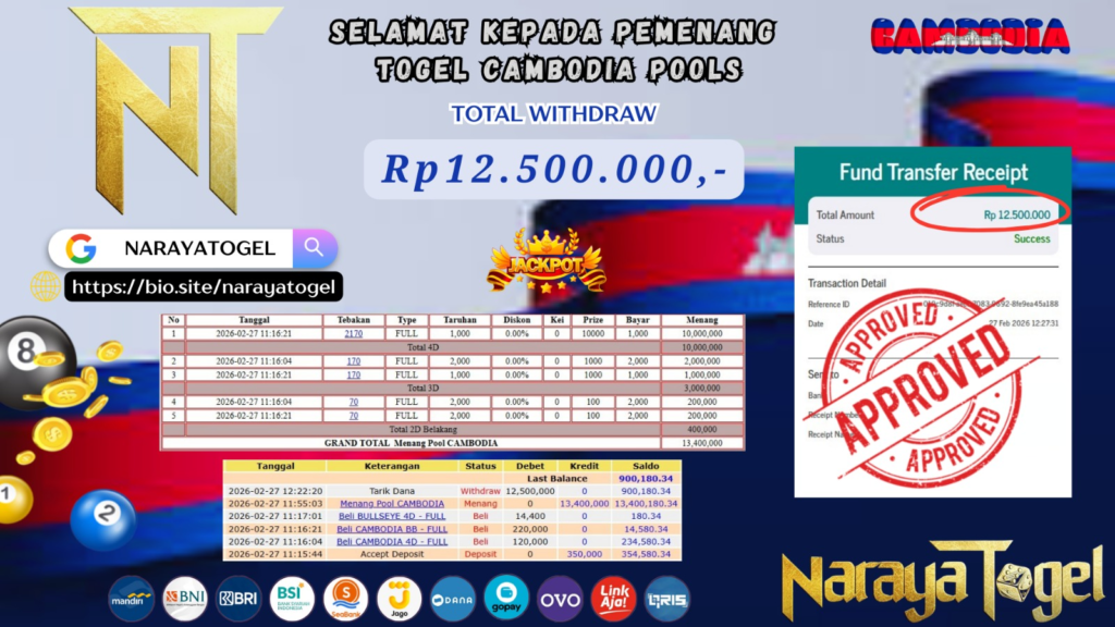 Selamat kepada User id TUI** Telah berhasil mendapatkan kemenangan besar pada permainan TOGEL CAMBODIA POOLS  Dengan kemenangan Sebesar  Rp 12.500.000 Setelah mengisi formulir withdraw dengan kurang waktu hanya 1 – 10 menit pihak NARAYATOGEL sudah melakukan transfer kepada pemiliknya dan dana sudah masuk ke rekening id tersebut oleh pemenang. Bukti pembayaran yang kami berikan merupakan bukti pembayaran yang SAH / VALID yang langsung di dapatkan melalui tanda transfer transaksi berhasil dari Bank yang di tuju.