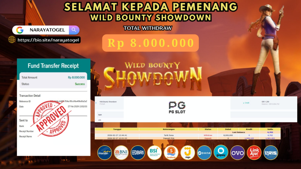 Selamat kepada User id POL** Telah berhasil mendapatkan kemenangan besar pada permainan WILD BOUNTY SHOWDOWN Dengan kemenangan Sebesar  Rp 8.000.000 Setelah mengisi formulir withdraw dengan kurang waktu hanya 1 – 10 menit pihak NARAYATOGEL sudah melakukan transfer kepada pemiliknya dan dana sudah masuk ke rekening id tersebut oleh pemenang. Bukti pembayaran yang kami berikan merupakan bukti pembayaran yang SAH / VALID yang langsung di dapatkan melalui tanda transfer transaksi berhasil dari Bank yang di tuju.