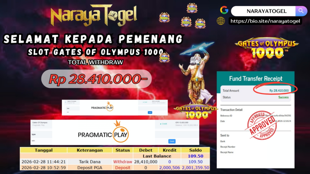 Selamat kepada User id HOP* Telah berhasil mendapatkan kemenangan besar pada permainan SLOT GATES OF OLYMPUS 1000 Dengan kemenangan Sebesar Rp 28.410.000 Setelah mengisi formulir withdraw dengan kurang waktu hanya 1 – 10 menit pihak NARAYATOGEL sudah melakukan transfer kepada pemiliknya dan dana sudah masuk ke rekening id tersebut oleh pemenang. Bukti pembayaran yang kami berikan merupakan bukti pembayaran yang SAH / VALID yang langsung di dapatkan melalui tanda transfer transaksi berhasil dari Bank yang di tuju.
