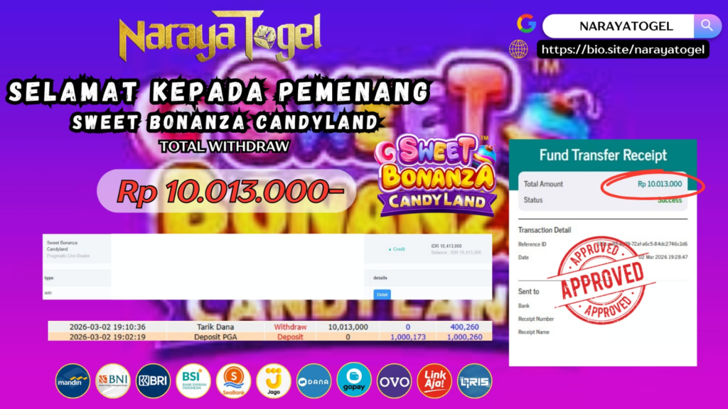 Selamat kepada User id HIO*** Telah berhasil mendapatkan kemenangan besar pada permainan SWEET BONANZA CANDYLAND  Dengan kemenangan Sebesar Rp 10.013.000  Setelah mengisi formulir withdraw dengan kurang waktu hanya 1 – 10 menit pihak NARAYATOGEL sudah melakukan transfer kepada pemiliknya dan dana sudah masuk ke rekening id tersebut oleh pemenang. Bukti pembayaran yang kami berikan merupakan bukti pembayaran yang SAH / VALID yang langsung di dapatkan melalui tanda transfer transaksi berhasil dari Bank yang di tuju.