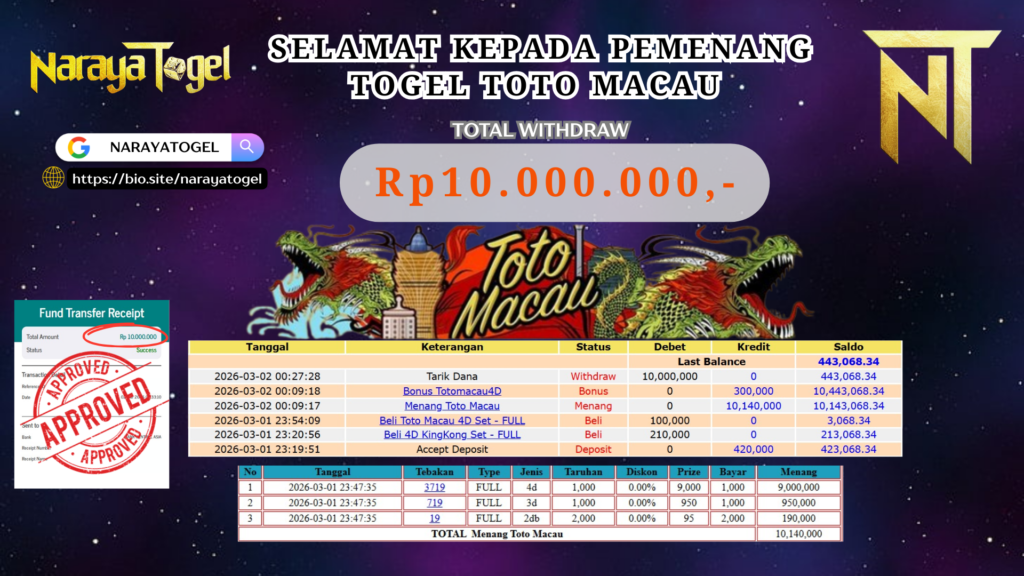 Selamat kepada User id WERRU** Telah berhasil mendapatkan kemenangan besar pada permainan TOTO MACAU 4D Dengan kemenangan Sebesar Rp 10.000.000 Setelah mengisi formulir withdraw dengan kurang waktu hanya 1 – 10 menit pihak NARAYATOGEL sudah melakukan transfer kepada pemiliknya dan dana sudah masuk ke rekening id tersebut oleh pemenang. Bukti pembayaran yang kami berikan merupakan bukti pembayaran yang SAH / VALID yang langsung di dapatkan melalui tanda transfer transaksi berhasil dari Bank yang di tuju.