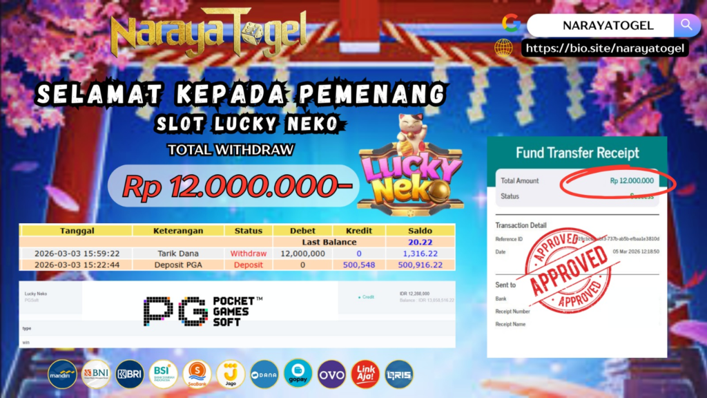 Selamat kepada User id ert** Telah berhasil mendapatkan kemenangan besar pada permainan SLOT LUCKY NEKO Dengan kemenangan Sebesar Rp 12.000.000 Setelah mengisi formulir withdraw dengan kurang waktu hanya 1 – 10 menit pihak NARAYATOGEL sudah melakukan transfer kepada pemiliknya dan dana sudah masuk ke rekening id tersebut oleh pemenang. Bukti pembayaran yang kami berikan merupakan bukti pembayaran yang SAH / VALID yang langsung di dapatkan melalui tanda transfer transaksi berhasil dari Bank yang di tuju.