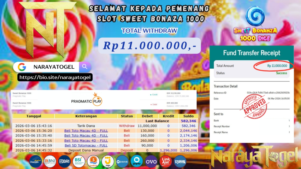 Selamat kepada User id SPO** Telah berhasil mendapatkan kemenangan besar pada permainan SLOT SWEET BONAZA 1000    Dengan kemenangan Sebesar  Rp 11.000.000 Setelah mengisi formulir withdraw dengan kurang waktu hanya 1 – 10 menit pihak NARAYATOGEL sudah melakukan transfer kepada pemiliknya dan dana sudah masuk ke rekening id tersebut oleh pemenang. Bukti pembayaran yang kami berikan merupakan bukti pembayaran yang SAH / VALID yang langsung di dapatkan melalui tanda transfer transaksi berhasil dari Bank yang di tuju.