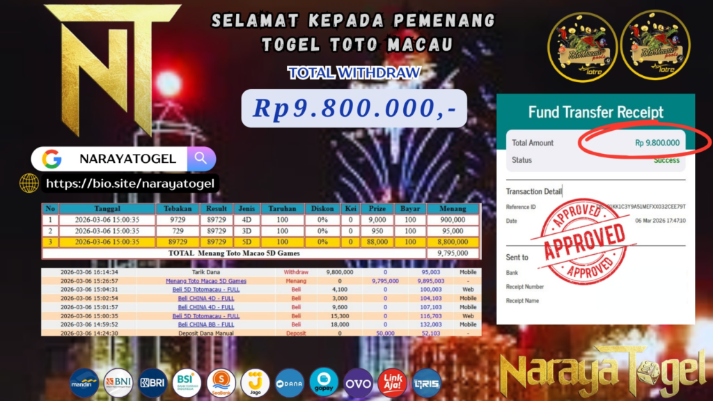 Masih ragu dengan NARAYA TOGEL bos ? Di mana bandar togel online sekarang yang terpercaya seperti NARAYATOGEL ? Bandar yang mengirimkan kemenangan member tanpa bertele – tele. Jadi…. tidak perlu khawatir pada situs NARAYA TOGEL karena kemenangan anda berapapun akan dibayarakan hingga lunas kepada pemenang.