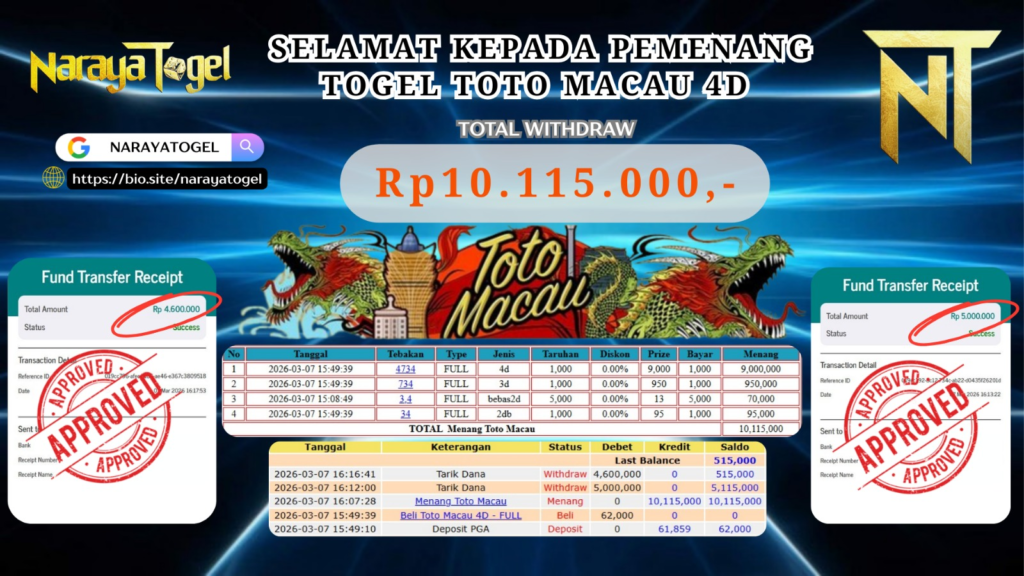 Selamat kepada User id WUII*** Telah berhasil mendapatkan kemenangan besar pada permainan TOGEL TOTO MACAU 4D     Dengan kemenangan Sebesar Rp 10.115.000 Setelah mengisi formulir withdraw dengan kurang waktu hanya 1 – 10 menit pihak NARAYATOGEL sudah melakukan transfer kepada pemiliknya dan dana sudah masuk ke rekening id tersebut oleh pemenang. Bukti pembayaran yang kami berikan merupakan bukti pembayaran yang SAH / VALID yang langsung di dapatkan melalui tanda transfer transaksi berhasil dari Bank yang di tuju.