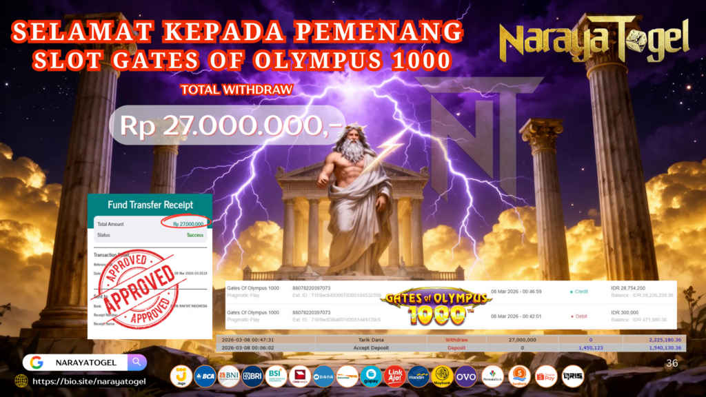 Selamat kepada User id RESWT*** Telah berhasil mendapatkan kemenangan besar pada permainan SLOT GATES OF OLYMPUS 1000 Dengan kemenangan Sebesar Rp 27.000.000 Setelah mengisi formulir withdraw dengan kurang waktu hanya 1 – 10 menit pihak NARAYATOGEL sudah melakukan transfer kepada pemiliknya dan dana sudah masuk ke rekening id tersebut oleh pemenang. Bukti pembayaran yang kami berikan merupakan bukti pembayaran yang SAH / VALID yang langsung di dapatkan melalui tanda transfer transaksi berhasil dari Bank yang di tuju.