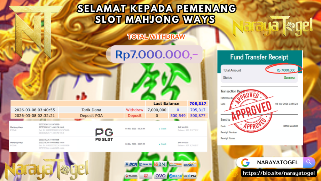 Selamat kepada User id WERYI** Telah berhasil mendapatkan kemenangan besar pada permainan SLOT MAHJONG WAYS Dengan kemenangan Sebesar Rp 7.000.000 Setelah mengisi formulir withdraw dengan kurang waktu hanya 1 – 10 menit pihak NARAYATOGEL sudah melakukan transfer kepada pemiliknya dan dana sudah masuk ke rekening id tersebut oleh pemenang. Bukti pembayaran yang kami berikan merupakan bukti pembayaran yang SAH / VALID yang langsung di dapatkan melalui tanda transfer transaksi berhasil dari Bank yang di tuju.