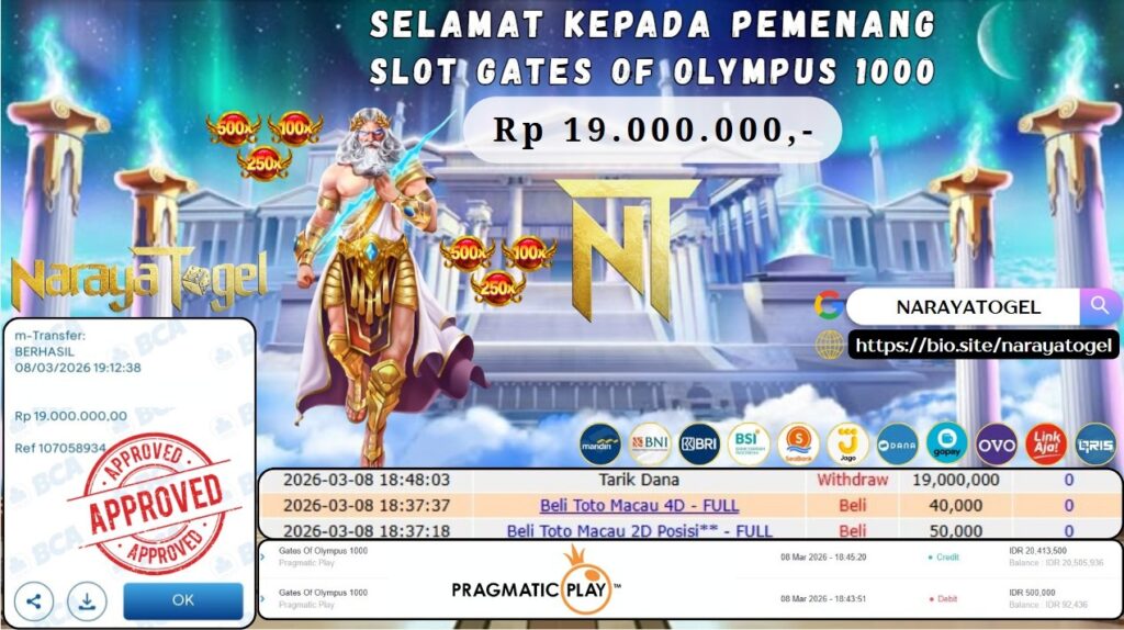 Selamat kepada User id WERRI*** Telah berhasil mendapatkan kemenangan besar pada permainan SLOT GATES OF OLYMPUS 1000 Dengan kemenangan Sebesar Rp 19.000.000 Setelah mengisi formulir withdraw dengan kurang waktu hanya 1 – 10 menit pihak NARAYATOGEL sudah melakukan transfer kepada pemiliknya dan dana sudah masuk ke rekening id tersebut oleh pemenang. Bukti pembayaran yang kami berikan merupakan bukti pembayaran yang SAH / VALID yang langsung di dapatkan melalui tanda transfer transaksi berhasil dari Bank yang di tuju.