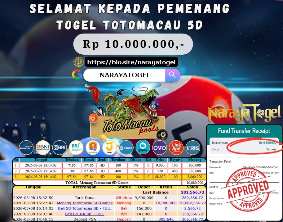 Selamat kepada User id BECKA*** Telah berhasil mendapatkan kemenangan besar pada permainan TOTO MACAU 4D Dengan kemenangan Sebesar Rp 10.000.000 Setelah mengisi formulir withdraw dengan kurang waktu hanya 1 – 10 menit pihak NARAYATOGEL sudah melakukan transfer kepada pemiliknya dan dana sudah masuk ke rekening id tersebut oleh pemenang. Bukti pembayaran yang kami berikan merupakan bukti pembayaran yang SAH / VALID yang langsung di dapatkan melalui tanda transfer transaksi berhasil dari Bank yang di tuju.