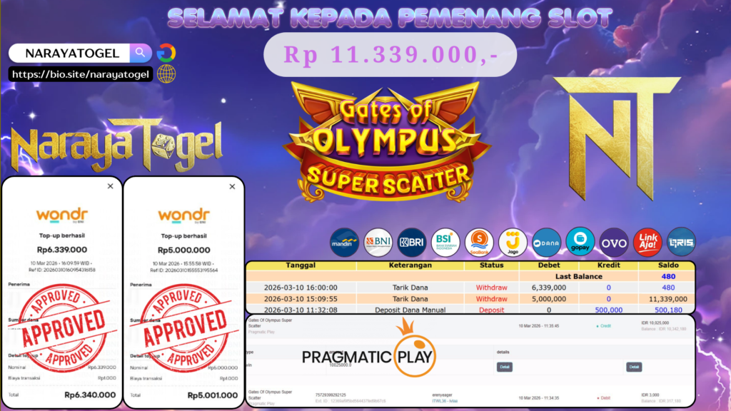 Selamat kepada User id YH*** Telah berhasil mendapatkan kemenangan besar pada permainan SLOT GATES OF OLYMPUS SUPER SCATTER Dengan kemenangan Sebesar Rp 11.339.000 Setelah mengisi formulir withdraw dengan kurang waktu hanya 1 – 10 menit pihak NARAYATOGEL sudah melakukan transfer kepada pemiliknya dan dana sudah masuk ke rekening id tersebut oleh pemenang. Bukti pembayaran yang kami berikan merupakan bukti pembayaran yang SAH / VALID yang langsung di dapatkan melalui tanda transfer transaksi berhasil dari Bank yang di tuju.