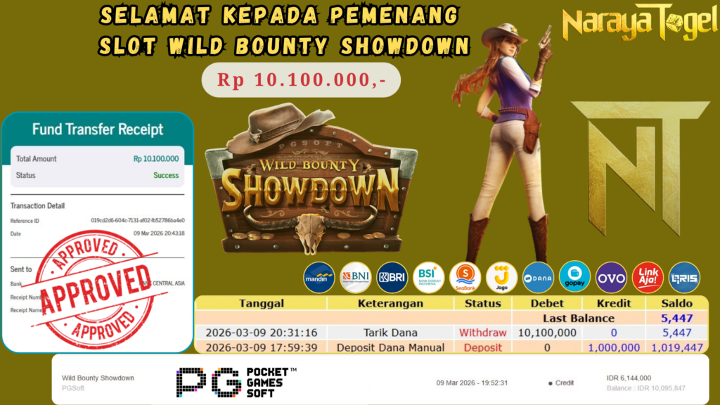 Selamat kepada User id SUL** Telah berhasil mendapatkan kemenangan besar pada permainan SLOT WILD BOUNTY SHOWDOWN Dengan kemenangan Sebesar Rp 10.100.000 Setelah mengisi formulir withdraw dengan kurang waktu hanya 1 – 10 menit pihak NARAYATOGEL sudah melakukan transfer kepada pemiliknya dan dana sudah masuk ke rekening id tersebut oleh pemenang. Bukti pembayaran yang kami berikan merupakan bukti pembayaran yang SAH / VALID yang langsung di dapatkan melalui tanda transfer transaksi berhasil dari Bank yang di tuju.