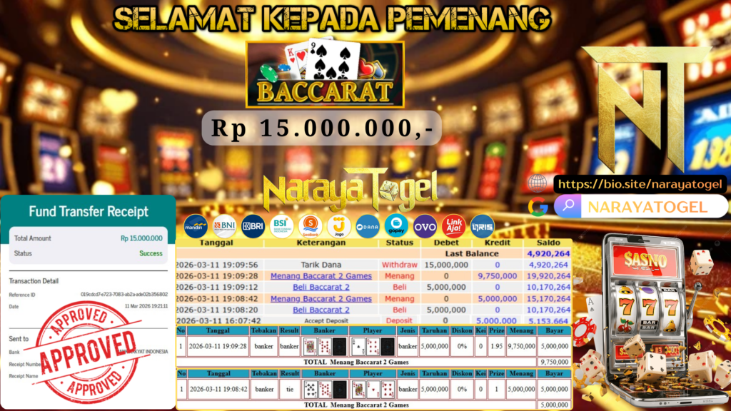 Selamat kepada User id GUFF** Telah berhasil mendapatkan kemenangan besar pada permainan LIVE GAME BACCARAT 2 GAMES Dengan kemenangan Sebesar Rp 15.000.000 Setelah mengisi formulir withdraw dengan kurang waktu hanya 1 – 10 menit pihak NARAYATOGEL sudah melakukan transfer kepada pemiliknya dan dana sudah masuk ke rekening id tersebut oleh pemenang. Bukti pembayaran yang kami berikan merupakan bukti pembayaran yang SAH / VALID yang langsung di dapatkan melalui tanda transfer transaksi berhasil dari Bank yang di tuju.