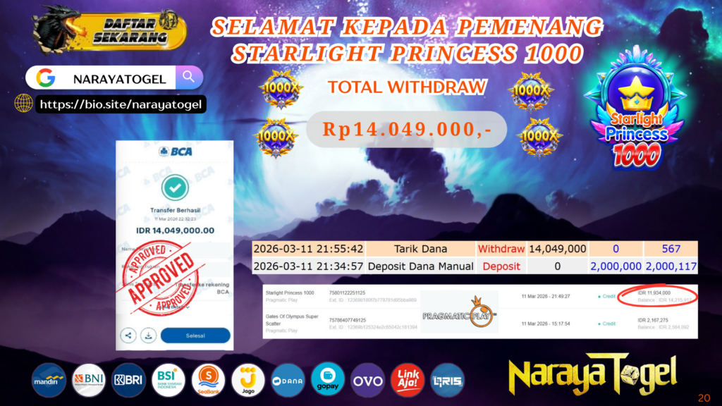 Selamat kepada User id ARIE** Telah berhasil mendapatkan kemenangan besar pada permainan SLOT STARLIGHT PRINCESS 1000 Dengan kemenangan Sebesar Rp 14.049.000 Setelah mengisi formulir withdraw dengan kurang waktu hanya 1 – 10 menit pihak NARAYATOGEL sudah melakukan transfer kepada pemiliknya dan dana sudah masuk ke rekening id tersebut oleh pemenang. Bukti pembayaran yang kami berikan merupakan bukti pembayaran yang SAH / VALID yang langsung di dapatkan melalui tanda transfer transaksi berhasil dari Bank yang di tuju.