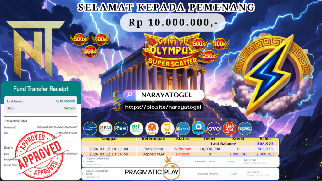 Selamat kepada User id LUCKY** Telah berhasil mendapatkan kemenangan besar pada permainan SLOT GATES OLYMPUS SUPER SCATTER Dengan kemenangan Sebesar Rp 10.000.000 Setelah mengisi formulir withdraw dengan kurang waktu hanya 1 – 10 menit pihak NARAYATOGEL sudah melakukan transfer kepada pemiliknya dan dana sudah masuk ke rekening id tersebut oleh pemenang. Bukti pembayaran yang kami berikan merupakan bukti pembayaran yang SAH / VALID yang langsung di dapatkan melalui tanda transfer transaksi berhasil dari Bank yang di tuju.