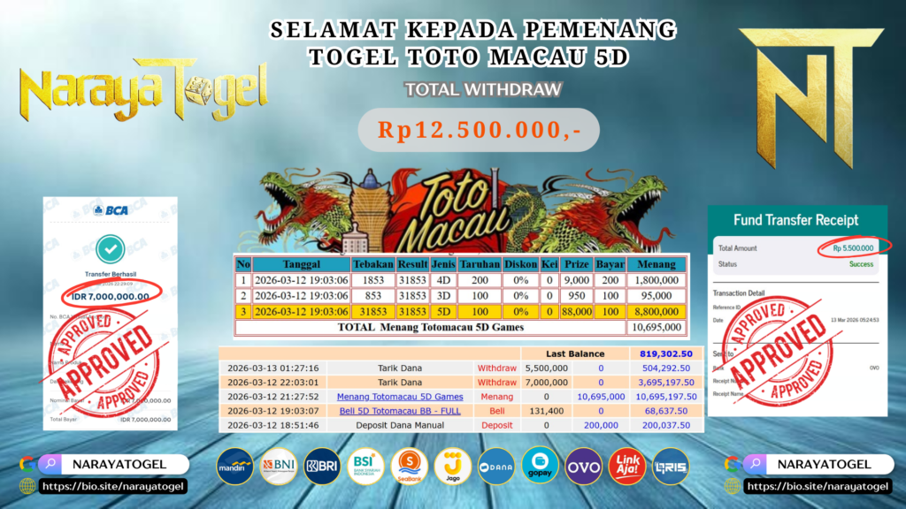 Selamat kepada User id ROHHIE*** Telah berhasil mendapatkan kemenangan besar pada permainan TOGEL TOTO MACAU 5D Dengan kemenangan Sebesar Rp 12.500.000 Setelah mengisi formulir withdraw dengan kurang waktu hanya 1 – 10 menit pihak NARAYATOGEL sudah melakukan transfer kepada pemiliknya dan dana sudah masuk ke rekening id tersebut oleh pemenang. Bukti pembayaran yang kami berikan merupakan bukti pembayaran yang SAH / VALID yang langsung di dapatkan melalui tanda transfer transaksi berhasil dari Bank yang di tuju.