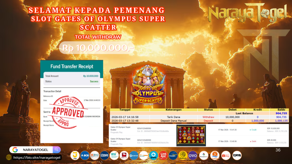 Selamat kepada User id UOEL** Telah berhasil mendapatkan kemenangan besar pada permainan SLOT GATES OF OLYMPUS SUPER SCATTER Dengan kemenangan Sebesar Rp 10.000.000 Setelah mengisi formulir withdraw dengan kurang waktu hanya 1 – 10 menit pihak NARAYATOGEL sudah melakukan transfer kepada pemiliknya dan dana sudah masuk ke rekening id tersebut oleh pemenang. Bukti pembayaran yang kami berikan merupakan bukti pembayaran yang SAH / VALID yang langsung di dapatkan melalui tanda transfer transaksi berhasil dari Bank yang di tuju.