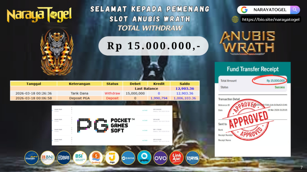 Selamat kepada User id gre*** Telah berhasil mendapatkan kemenangan besar pada permainan SLOT anubis wrath Dengan kemenangan Sebesar Rp 15.000.000 Setelah mengisi formulir withdraw dengan kurang waktu hanya 1 – 10 menit pihak NARAYATOGEL sudah melakukan transfer kepada pemiliknya dan dana sudah masuk ke rekening id tersebut oleh pemenang. Bukti pembayaran yang kami berikan merupakan bukti pembayaran yang SAH / VALID yang langsung di dapatkan melalui tanda transfer transaksi berhasil dari Bank yang di tuju.