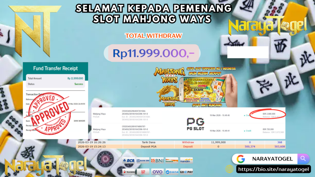 Selamat kepada User id KATANN*** Telah berhasil mendapatkan kemenangan besar pada permainan SLOT MAHJONG WAYS Dengan kemenangan Sebesar Rp 11.999.000 Setelah mengisi formulir withdraw dengan kurang waktu hanya 1 – 10 menit pihak NARAYATOGEL sudah melakukan transfer kepada pemiliknya dan dana sudah masuk ke rekening id tersebut oleh pemenang. Bukti pembayaran yang kami berikan merupakan bukti pembayaran yang SAH / VALID yang langsung di dapatkan melalui tanda transfer transaksi berhasil dari Bank yang di tuju.