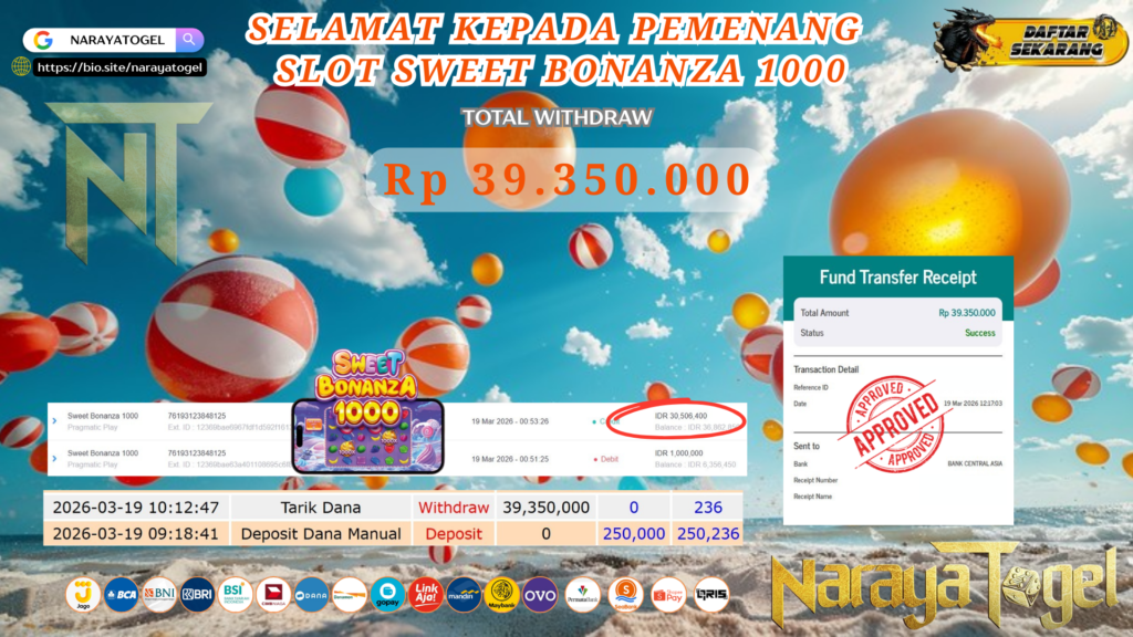 Selamat kepada User id LUCIA*** Telah berhasil mendapatkan kemenangan besar pada permainan SLOT SWEET BONANZA 1000 Dengan kemenangan Sebesar Rp 39.350.000 Setelah mengisi formulir withdraw dengan kurang waktu hanya 1 – 10 menit pihak NARAYATOGEL sudah melakukan transfer kepada pemiliknya dan dana sudah masuk ke rekening id tersebut oleh pemenang. Bukti pembayaran yang kami berikan merupakan bukti pembayaran yang SAH / VALID yang langsung di dapatkan melalui tanda transfer transaksi berhasil dari Bank yang di tuju.