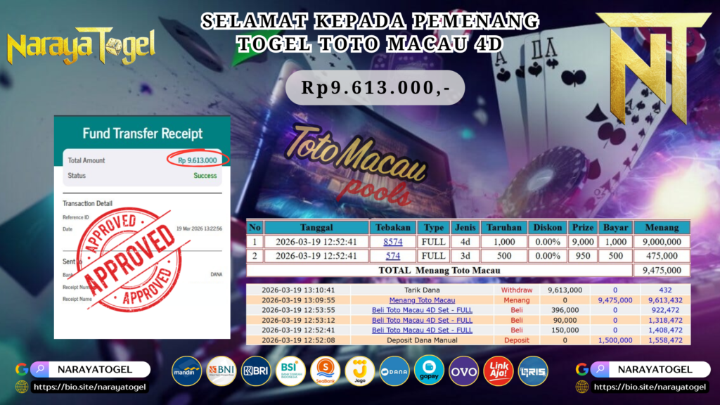 Selamat kepada User id LUKM** Telah berhasil mendapatkan kemenangan besar pada permainan TOGEL TOTO MACAU 4D Dengan kemenangan Sebesar Rp 9.613.000 Setelah mengisi formulir withdraw dengan kurang waktu hanya 1 – 10 menit pihak NARAYATOGEL sudah melakukan transfer kepada pemiliknya dan dana sudah masuk ke rekening id tersebut oleh pemenang. Bukti pembayaran yang kami berikan merupakan bukti pembayaran yang SAH / VALID yang langsung di dapatkan melalui tanda transfer transaksi berhasil dari Bank yang di tuju.