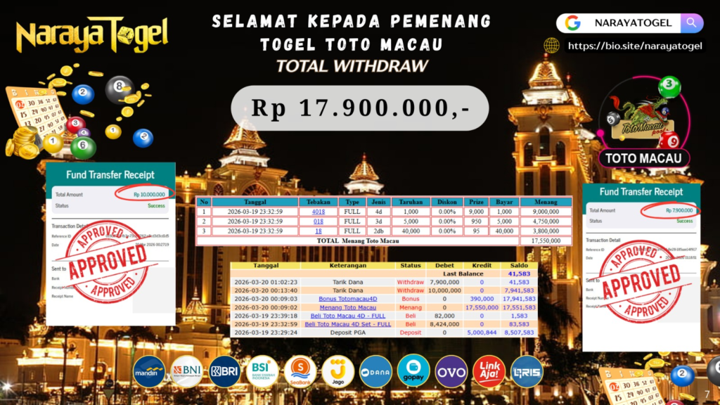 Selamat kepada User id WERT*** Telah berhasil mendapatkan kemenangan besar pada permainan TOGEL TOTO MACAU Dengan kemenangan Sebesar Rp 17.900.000 Setelah mengisi formulir withdraw dengan kurang waktu hanya 1 – 10 menit pihak NARAYATOGEL sudah melakukan transfer kepada pemiliknya dan dana sudah masuk ke rekening id tersebut oleh pemenang. Bukti pembayaran yang kami berikan merupakan bukti pembayaran yang SAH / VALID yang langsung di dapatkan melalui tanda transfer transaksi berhasil dari Bank yang di tuju.