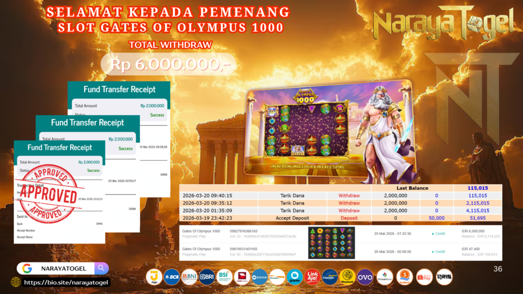 Selamat kepada User id TITI*** Telah berhasil mendapatkan kemenangan besar pada permainan SLOT GATES OF OLYMPUS 1000 Dengan kemenangan Sebesar Rp 6.000.000 Setelah mengisi formulir withdraw dengan kurang waktu hanya 1 – 10 menit pihak NARAYATOGEL sudah melakukan transfer kepada pemiliknya dan dana sudah masuk ke rekening id tersebut oleh pemenang. Bukti pembayaran yang kami berikan merupakan bukti pembayaran yang SAH / VALID yang langsung di dapatkan melalui tanda transfer transaksi berhasil dari Bank yang di tuju.