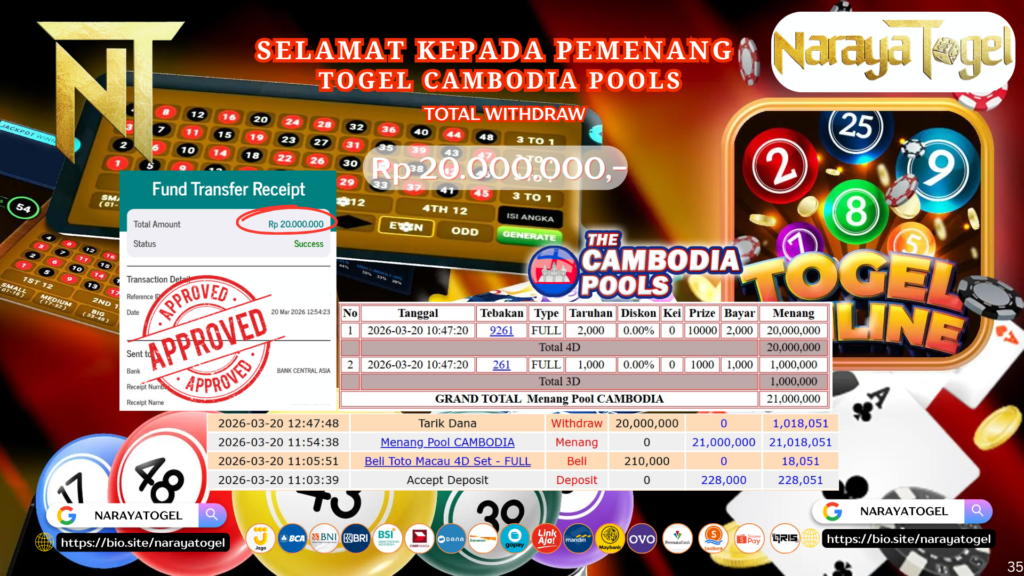 Selamat kepada User id DAVI** Telah berhasil mendapatkan kemenangan besar pada permainan TOGEL CAMBODIA POOLS 4D Dengan kemenangan Sebesar Rp 20.000.000 Setelah mengisi formulir withdraw dengan kurang waktu hanya 1 – 10 menit pihak NARAYATOGEL sudah melakukan transfer kepada pemiliknya dan dana sudah masuk ke rekening id tersebut oleh pemenang. Bukti pembayaran yang kami berikan merupakan bukti pembayaran yang SAH / VALID yang langsung di dapatkan melalui tanda transfer transaksi berhasil dari Bank yang di tuju.