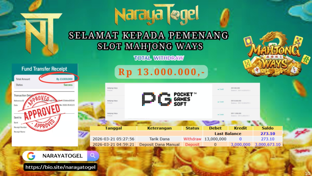 Selamat kepada User id GIOP** Telah berhasil mendapatkan kemenangan besar pada permainan SLOT MAHJONG WAYS Dengan kemenangan Sebesar Rp 13.000.000 Setelah mengisi formulir withdraw dengan kurang waktu hanya 1 – 10 menit pihak NARAYATOGEL sudah melakukan transfer kepada pemiliknya dan dana sudah masuk ke rekening id tersebut oleh pemenang. Bukti pembayaran yang kami berikan merupakan bukti pembayaran yang SAH / VALID yang langsung di dapatkan melalui tanda transfer transaksi berhasil dari Bank yang di tuju.