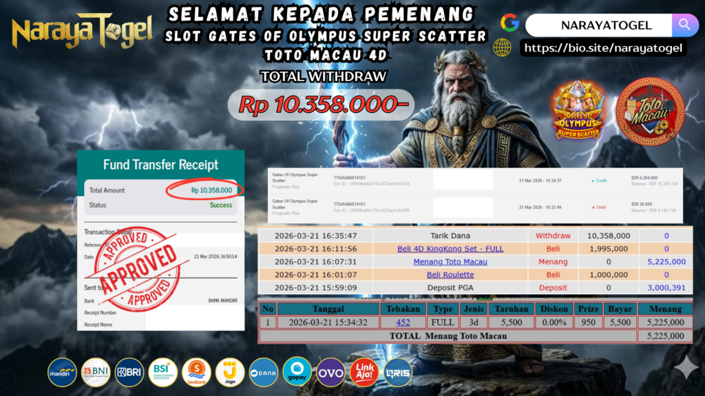 Selamat kepada User id BECKHA*** Telah berhasil mendapatkan kemenangan besar pada permainan TOTO MACAU 4D & SLOT GATES OF OLYMPUS SUPER SCATTER Dengan kemenangan Sebesar Rp 10.358.000 Setelah mengisi formulir withdraw dengan kurang waktu hanya 1 – 10 menit pihak NARAYATOGEL sudah melakukan transfer kepada pemiliknya dan dana sudah masuk ke rekening id tersebut oleh pemenang. Bukti pembayaran yang kami berikan merupakan bukti pembayaran yang SAH / VALID yang langsung di dapatkan melalui tanda transfer transaksi berhasil dari Bank yang di tuju.
