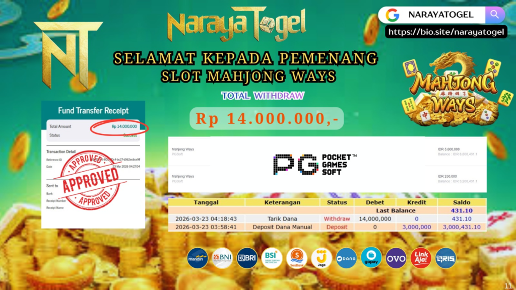 Selamat kepada User id SENG** Telah berhasil mendapatkan kemenangan besar pada permainan SLOT MAHJONG WAYS Dengan kemenangan Sebesar Rp 14.000.0000 Setelah mengisi formulir withdraw dengan kurang waktu hanya 1 – 10 menit pihak NARAYATOGEL sudah melakukan transfer kepada pemiliknya dan dana sudah masuk ke rekening id tersebut oleh pemenang. Bukti pembayaran yang kami berikan merupakan bukti pembayaran yang SAH / VALID yang langsung di dapatkan melalui tanda transfer transaksi berhasil dari Bank yang di tuju.