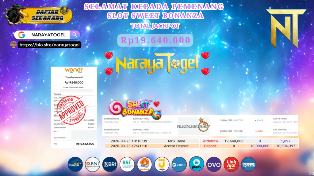 Selamat kepada User id IQBA** Telah berhasil mendapatkan kemenangan besar pada permainan SLOT SWEET BONANZA Dengan kemenangan Sebesar Rp 19.640.000Setelah mengisi formulir withdraw dengan kurang waktu hanya 1 – 10 menit pihak NARAYATOGEL sudah melakukan transfer kepada pemiliknya dan dana sudah masuk ke rekening id tersebut oleh pemenang. Bukti pembayaran yang kami berikan merupakan bukti pembayaran yang SAH / VALID yang langsung di dapatkan melalui tanda transfer transaksi berhasil dari Bank yang di tuju.
