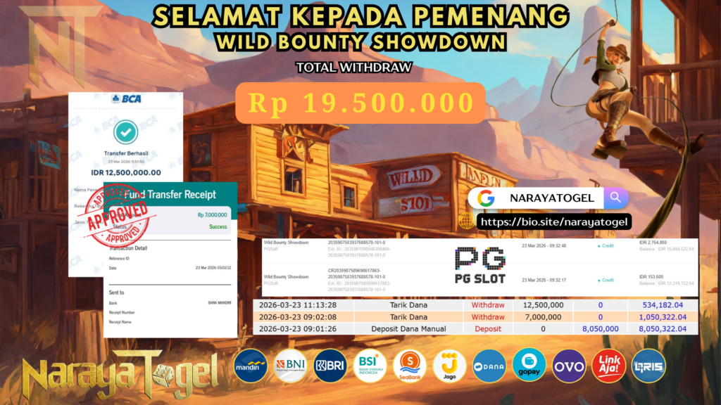 Selamat kepada User id LEWE*** Telah berhasil mendapatkan kemenangan besar pada permainan SLOT WILD BOUNTY SHOWDOWN  Dengan kemenangan Sebesar Rp 19.500.000 Setelah mengisi formulir withdraw dengan kurang waktu hanya 1 – 10 menit pihak NARAYATOGEL sudah melakukan transfer kepada pemiliknya dan dana sudah masuk ke rekening id tersebut oleh pemenang. Bukti pembayaran yang kami berikan merupakan bukti pembayaran yang SAH / VALID yang langsung di dapatkan melalui tanda transfer transaksi berhasil dari Bank yang di tuju.