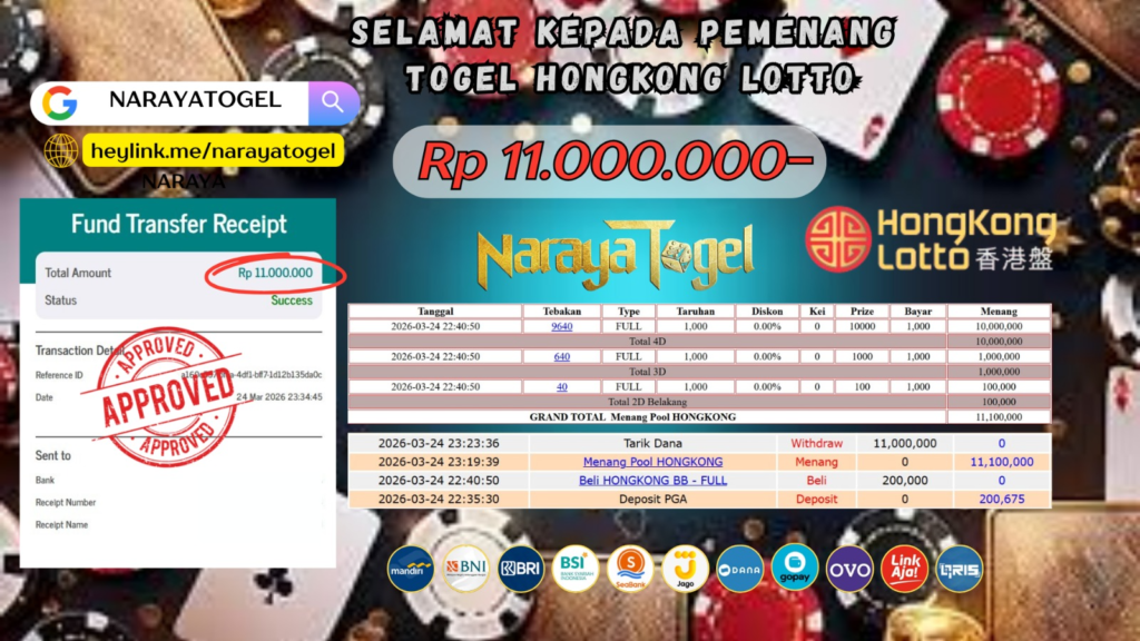 Masih ragu dengan NARAYA TOGEL bos ? Di mana bandar togel online sekarang yang terpercaya seperti NARAYATOGEL ? Bandar yang mengirimkan kemenangan member tanpa bertele – tele. Jadi…. tidak perlu khawatir pada situs NARAYA TOGEL karena kemenangan anda berapapun akan dibayarakan hingga lunas kepada pemenang.