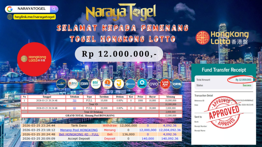 Selamat kepada User id REW*** Telah berhasil mendapatkan kemenangan besar pada permainan TOGEL HONGKONG LOTTO Dengan kemenangan Sebesar Rp 12.000.000 Setelah mengisi formulir withdraw dengan kurang waktu hanya 1 – 10 menit pihak NARAYATOGEL sudah melakukan transfer kepada pemiliknya dan dana sudah masuk ke rekening id tersebut oleh pemenang. Bukti pembayaran yang kami berikan merupakan bukti pembayaran yang SAH / VALID yang langsung di dapatkan melalui tanda transfer transaksi berhasil dari Bank yang di tuju.