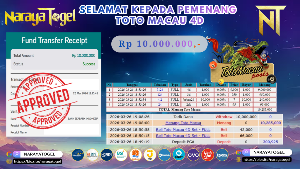 Masih ragu dengan NARAYA TOGEL bos ? Di mana bandar togel online sekarang yang terpercaya seperti NARAYATOGEL ? Bandar yang mengirimkan kemenangan member tanpa bertele – tele. Jadi…. tidak perlu khawatir pada situs NARAYA TOGEL karena kemenangan anda berapapun akan dibayarakan hingga lunas kepada pemenang.
