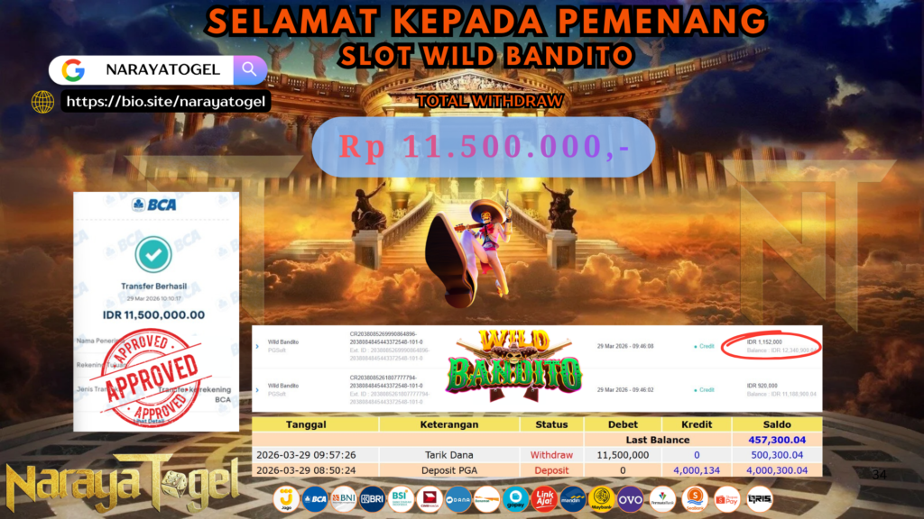 Selamat kepada User id FIKI*** Telah berhasil mendapatkan kemenangan besar pada permainan SLOT SLOT WILD BANDITO Dengan kemenangan Sebesar Rp 11.500.000 Setelah mengisi formulir withdraw dengan kurang waktu hanya 1 – 10 menit pihak NARAYATOGEL sudah melakukan transfer kepada pemiliknya dan dana sudah masuk ke rekening id tersebut oleh pemenang. Bukti pembayaran yang kami berikan merupakan bukti pembayaran yang SAH / VALID yang langsung di dapatkan melalui tanda transfer transaksi berhasil dari Bank yang di tuju.