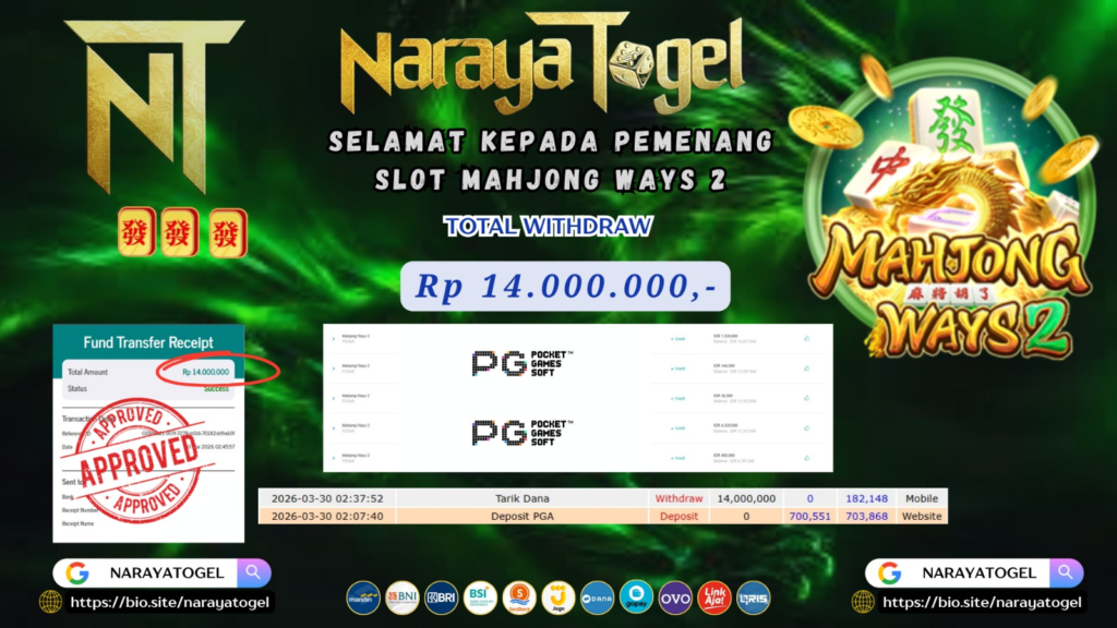 Selamat kepada User id SUKKK*** Telah berhasil mendapatkan kemenangan besar pada permainan SLOT MAHJONG WAYS 2 Dengan kemenangan Sebesar Rp 14.000.000 Setelah mengisi formulir withdraw dengan kurang waktu hanya 1 – 10 menit pihak NARAYATOGEL sudah melakukan transfer kepada pemiliknya dan dana sudah masuk ke rekening id tersebut oleh pemenang. Bukti pembayaran yang kami berikan merupakan bukti pembayaran yang SAH / VALID yang langsung di dapatkan melalui tanda transfer transaksi berhasil dari Bank yang di tuju.