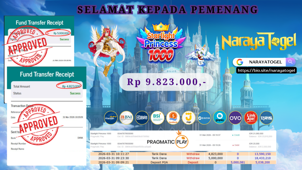 Selamat kepada User id HIPHO** Telah berhasil mendapatkan kemenangan besar pada permainan SLOT STARLIGHT PRINCESS 1000 Dengan kemenangan Sebesar  Rp 9.823.000 Setelah mengisi formulir withdraw dengan kurang waktu hanya 1 – 10 menit pihak NARAYATOGEL sudah melakukan transfer kepada pemiliknya dan dana sudah masuk ke rekening id tersebut oleh pemenang. Bukti pembayaran yang kami berikan merupakan bukti pembayaran yang SAH / VALID yang langsung di dapatkan melalui tanda transfer transaksi berhasil dari Bank yang di tuju.