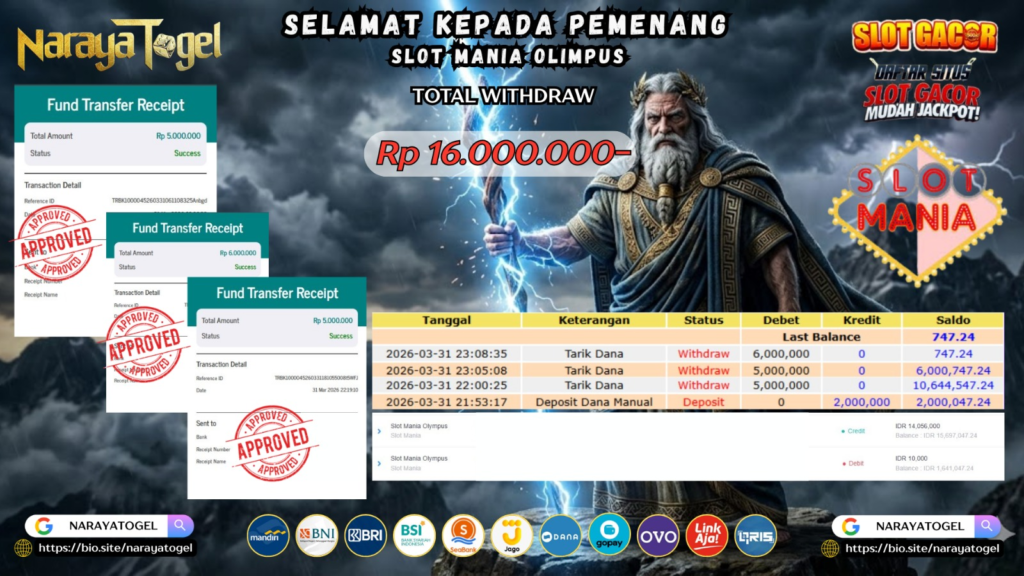 Selamat kepada User id RUUU** Telah berhasil mendapatkan kemenangan besar pada permainan SLOT mania olimpus Dengan kemenangan Sebesar Rp 16.000.000 Setelah mengisi formulir withdraw dengan kurang waktu hanya 1 – 10 menit pihak NARAYATOGEL sudah melakukan transfer kepada pemiliknya dan dana sudah masuk ke rekening id tersebut oleh pemenang. Bukti pembayaran yang kami berikan merupakan bukti pembayaran yang SAH / VALID yang langsung di dapatkan melalui tanda transfer transaksi berhasil dari Bank yang di tuju.