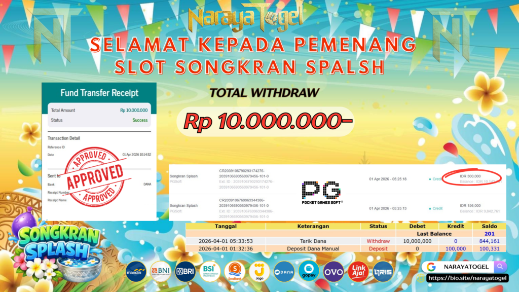 Selamat kepada User id LARAS*** Telah berhasil mendapatkan kemenangan besar pada permainan SLOT SONGKRAN SPALSH Dengan kemenangan Sebesar Rp 10.000.000 Setelah mengisi formulir withdraw dengan kurang waktu hanya 1 – 10 menit pihak NARAYATOGEL sudah melakukan transfer kepada pemiliknya dan dana sudah masuk ke rekening id tersebut oleh pemenang. Bukti pembayaran yang kami berikan merupakan bukti pembayaran yang SAH / VALID yang langsung di dapatkan melalui tanda transfer transaksi berhasil dari Bank yang di tuju.