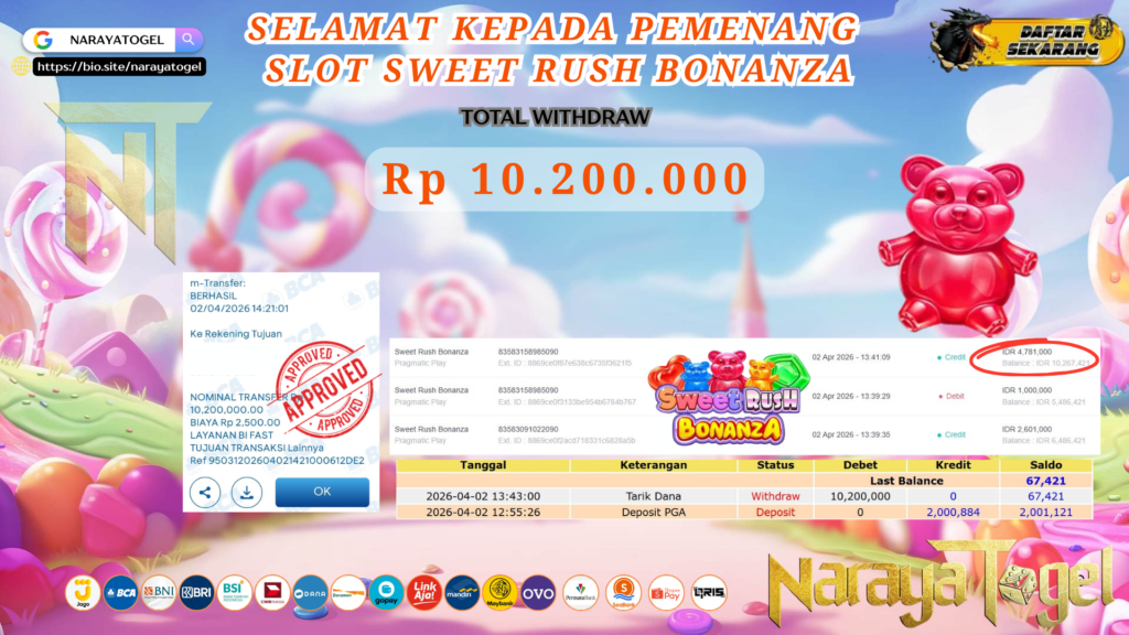 Selamat kepada User id RULLY*** Telah berhasil mendapatkan kemenangan besar pada permainan SLOT SWEET RUSH BONANZA Dengan kemenangan Sebesar Rp 10.200.000 Setelah mengisi formulir withdraw dengan kurang waktu hanya 1 – 10 menit pihak NARAYATOGEL sudah melakukan transfer kepada pemiliknya dan dana sudah masuk ke rekening id tersebut oleh pemenang. Bukti pembayaran yang kami berikan merupakan bukti pembayaran yang SAH / VALID yang langsung di dapatkan melalui tanda transfer transaksi berhasil dari Bank yang di tuju.