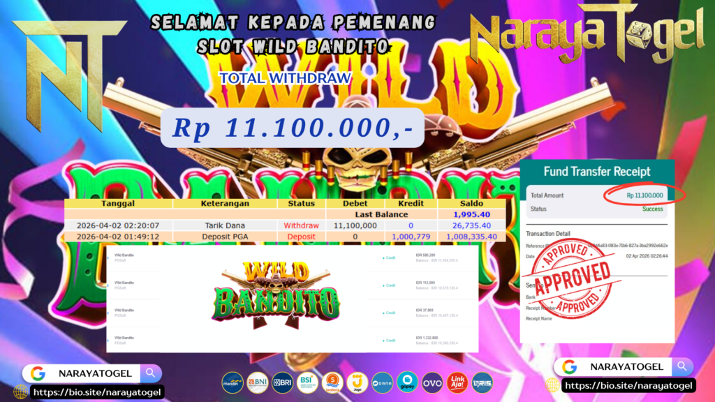 Selamat kepada User id TUNI*** Telah berhasil mendapatkan kemenangan besar pada permainan SLOT WILD BANDITO  Dengan kemenangan Sebesar Rp 11.100.000 Setelah mengisi formulir withdraw dengan kurang waktu hanya 1 – 10 menit pihak NARAYATOGEL sudah melakukan transfer kepada pemiliknya dan dana sudah masuk ke rekening id tersebut oleh pemenang. Bukti pembayaran yang kami berikan merupakan bukti pembayaran yang SAH / VALID yang langsung di dapatkan melalui tanda transfer transaksi berhasil dari Bank yang di tuju.