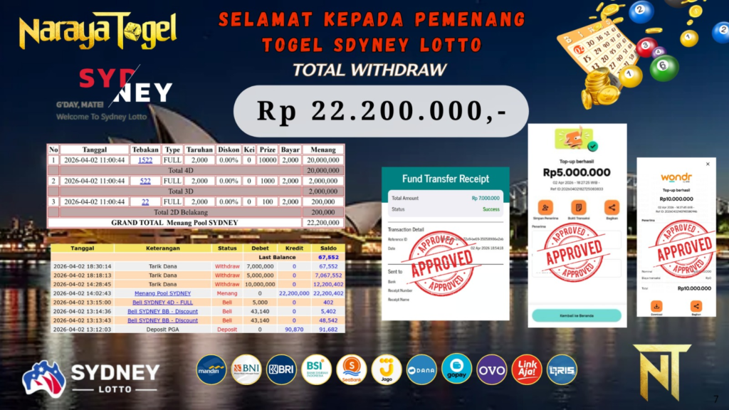 Selamat kepada User id HUI*** Telah berhasil mendapatkan kemenangan besar pada permainan TOGEL SDYNEY LOTTO  Dengan kemenangan Sebesar Rp 22.200.000 Setelah mengisi formulir withdraw dengan kurang waktu hanya 1 – 10 menit pihak NARAYATOGEL sudah melakukan transfer kepada pemiliknya dan dana sudah masuk ke rekening id tersebut oleh pemenang. Bukti pembayaran yang kami berikan merupakan bukti pembayaran yang SAH / VALID yang langsung di dapatkan melalui tanda transfer transaksi berhasil dari Bank yang di tuju.