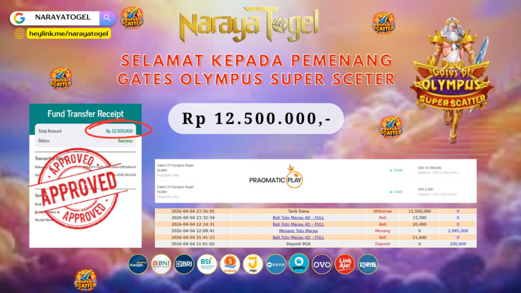 Selamat kepada User id YUI** Telah berhasil mendapatkan kemenangan besar pada permainan GATES OLYMPUS SUPER SCETER  Dengan kemenangan Sebesar  Rp 12.500.000 Setelah mengisi formulir withdraw dengan kurang waktu hanya 1 – 10 menit pihak NARAYATOGEL sudah melakukan transfer kepada pemiliknya dan dana sudah masuk ke rekening id tersebut oleh pemenang. Bukti pembayaran yang kami berikan merupakan bukti pembayaran yang SAH / VALID yang langsung di dapatkan melalui tanda transfer transaksi berhasil dari Bank yang di tuju.