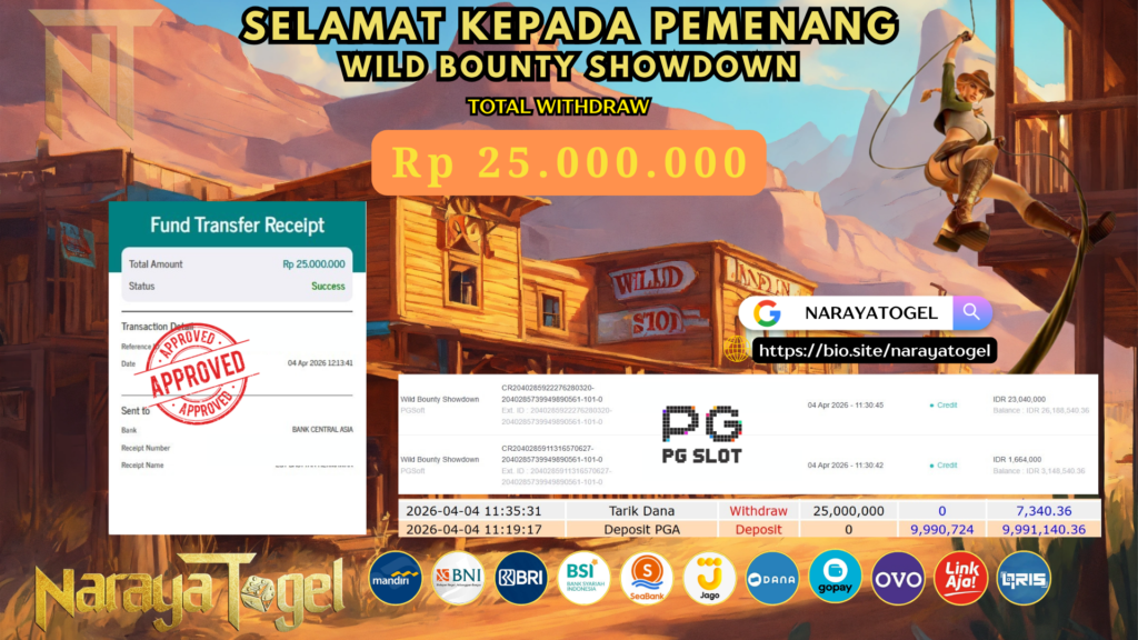 Selamat kepada User id EBII** Telah berhasil mendapatkan kemenangan besar pada permainan SLOT WILD BOUNTY SHOWDOWN Dengan kemenangan Sebesar  Rp 25.000.000 Setelah mengisi formulir withdraw dengan kurang waktu hanya 1 – 10 menit pihak NARAYATOGEL sudah melakukan transfer kepada pemiliknya dan dana sudah masuk ke rekening id tersebut oleh pemenang. Bukti pembayaran yang kami berikan merupakan bukti pembayaran yang SAH / VALID yang langsung di dapatkan melalui tanda transfer transaksi berhasil dari Bank yang di tuju.